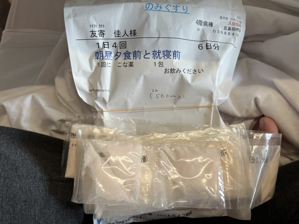 喉の痛み止めの粉薬が頭痛にも効くとのことで、少し早めにお薬摂取。その後すぐ夕飯でした。